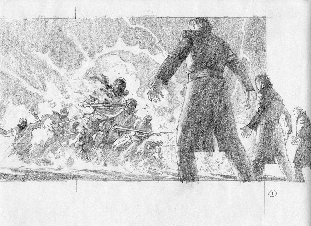 I have my own particular methods when it comes to action scenes. I choose the right perspective, then decide on foreground, middle ground, and background design. Like layers of action within the action. Light plays a major role in illuminating the layers and what I want the observer to look at and where. I control how they will absorb the piece. This is critical.
