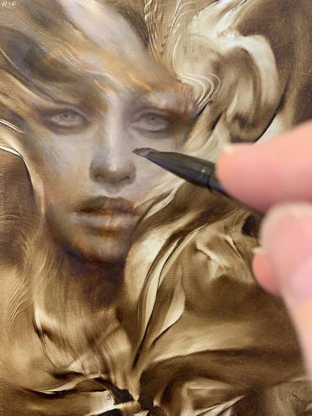 A small detail round sable was used to add small areas of warm lights to the abstract areas in the forehead to bring those lights forward again after adding a glaze of warmth that was darker there. Eventually, the background was glazed again to push it back into a darker value overall, and it was glazed so that the existing marks still show through.