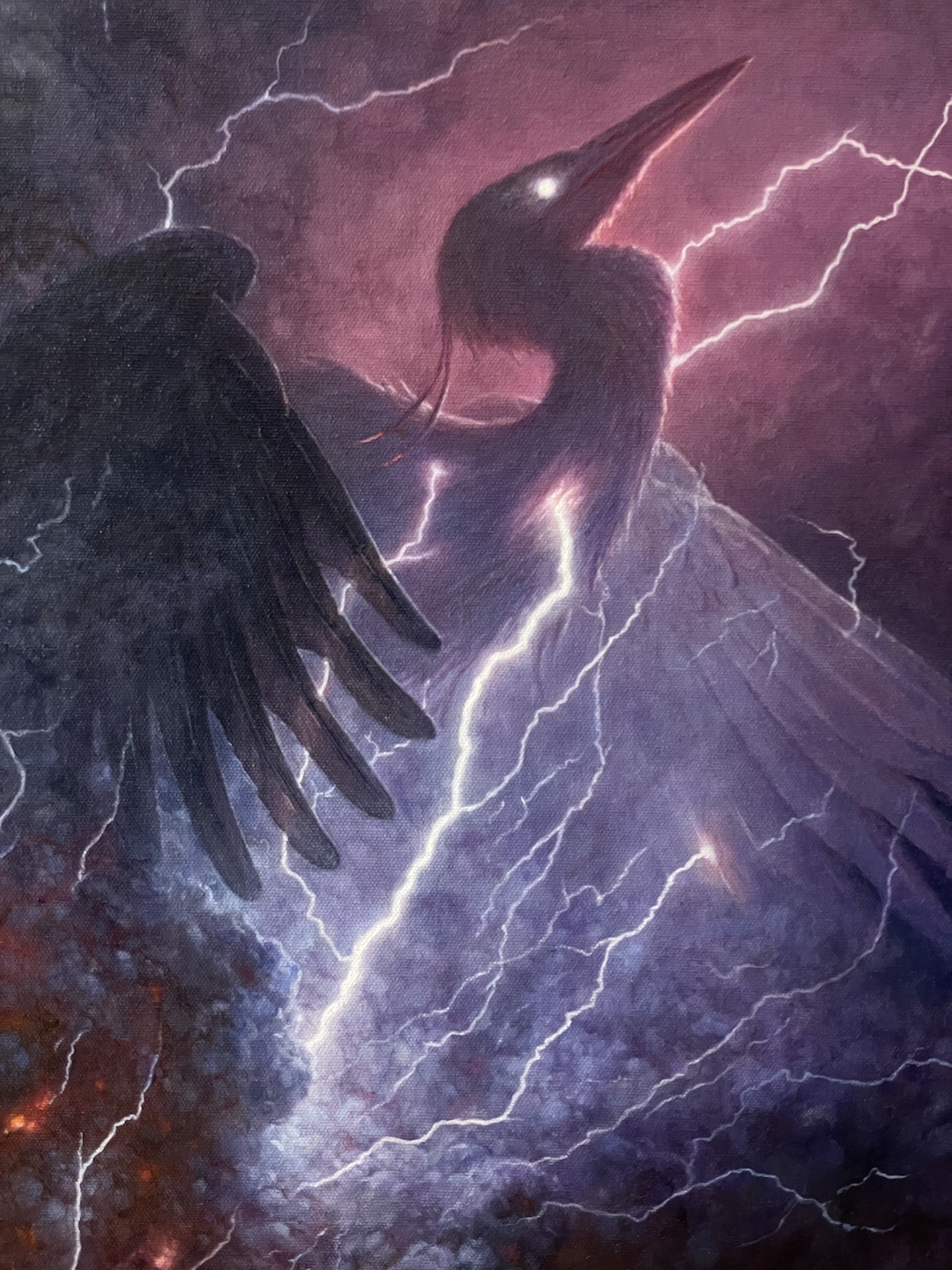 All that was left was to paint it all up in oils. Instinctively, I started with the focal point of the bird’s head and then moved outward from there. I realize that this image represents almost no progress and is of little insight, but it does show the painfully slow early days of figuring things out on this piece. Once I’d gained a foothold, I started to block in a lot more of the piece in oils. I think I realized suddenly that going after any level of detail was ill-advised without getting a better handle on the value structure as whole. I didn’t want to have to repaint important sections darker or lighter because I didn’t have my act completely together, and so I figured out how dark I was going to go and worked backwards from there. By now, I think I’d gotten a pretty good handle on where I was going and started diving into the details of the ash plume and the wing on the left. I knew I wanted some degree of transparency to the feathers, but I wasn’t quite sure how far to take it. Honestly, I really loved how I’d addressed that in the original mini-painting, but once I’d settled on the amount of lightning between the wings, that solution felt like it no longer worked completely, and so I spent a lot of time addressing the revised lighting scenario. Still tightening various areas up, getting my details figured out. In the case of both wings, I decided it worth articulating all the various details of the feathers despite the fact that I knew that they would end up being largely obscured by the smoke and ash plume. My reasoning was that it would be more difficult later on to indicate the detail than it would be to glaze or scumble paint over it.