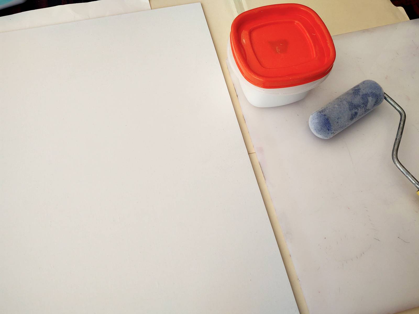 Using my small container of gesso, a sponge roller and a plastic pallete, I am ready to prime my panels.