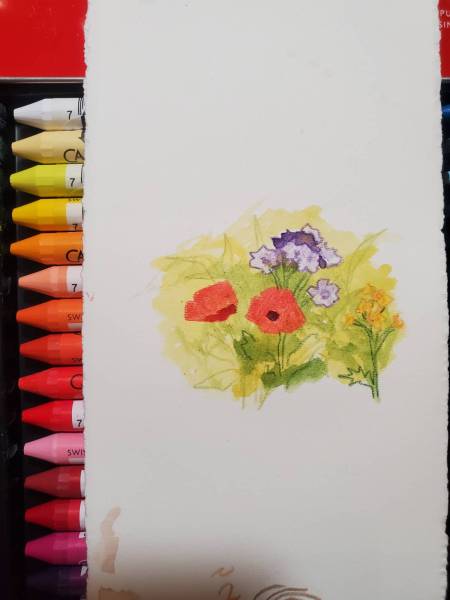 In the test, the flowers were colored with wax pastel first, them a wash of watercolor over them. The wax did its job and resisted the watercolor!