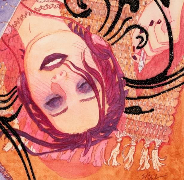 Now that Chapter 3 is underway and I knew the cover would prominently feature a particular album cover from the story, I wanted to paint the album cover in question ahead of doing the final composition. And I felt that a similar resist effect would be amazing done in color instead of clear wax. I wanted the flowers to have a lot of vibrant pop and sharp edges, which can be done in watercolor but they’d need to be painted last, and I still wanted to be able to adjust the yellow/greens around them without risking the red contaminating the other colors.