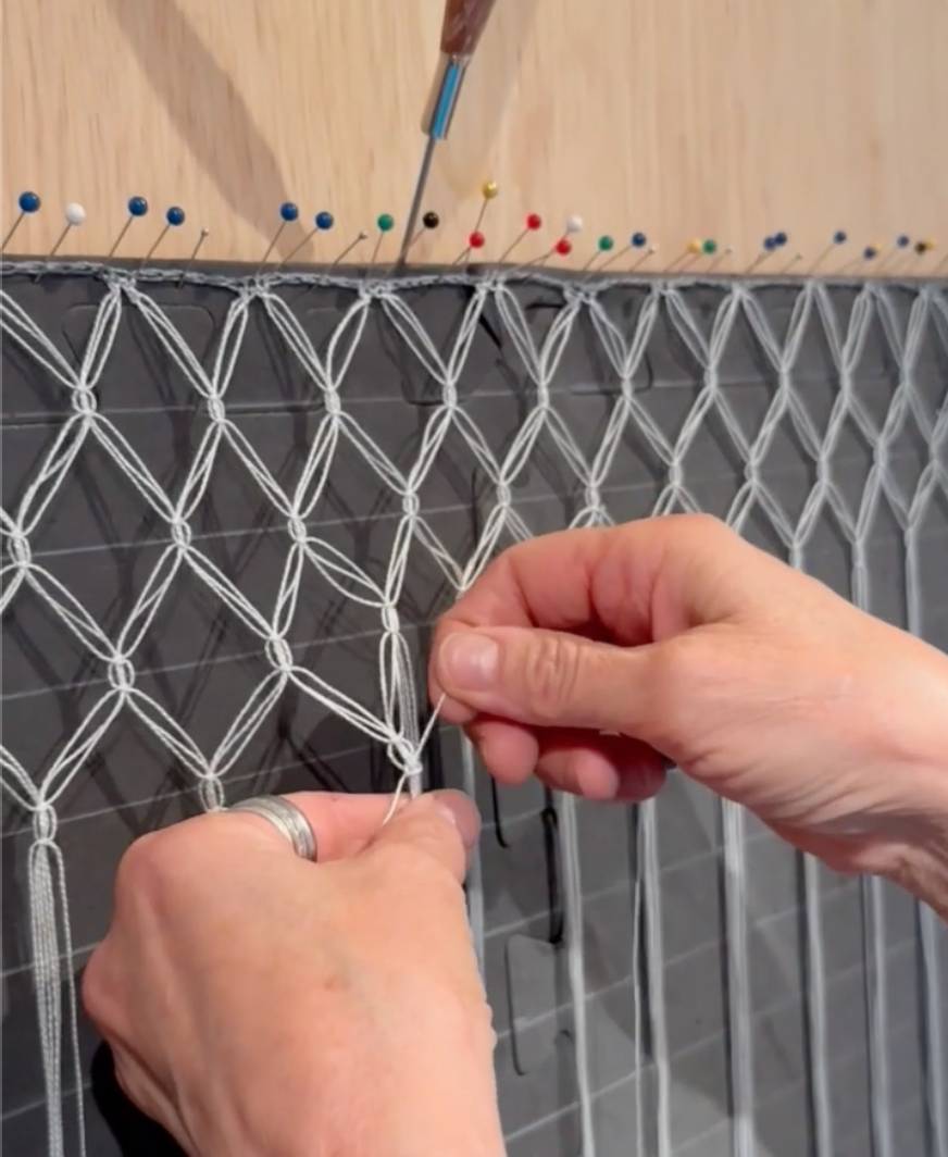Based on this basic weave, I created my own new pattern that had the three strings between the knots and a more ornamental double knot accent between the threads. The added bonus was that I found thread that matched the color of the sculpture perfectly and I could re-create the ombré transitions to echo the sculpture’s finish. This made the fabric really look like it was an intentional part of the piece. This macramé version is a bit simpler than the Solomon’s Knot, but has an elaborate feel and a delicacy that I find attractive, plus the sculpture is more visible through it.