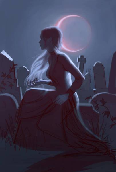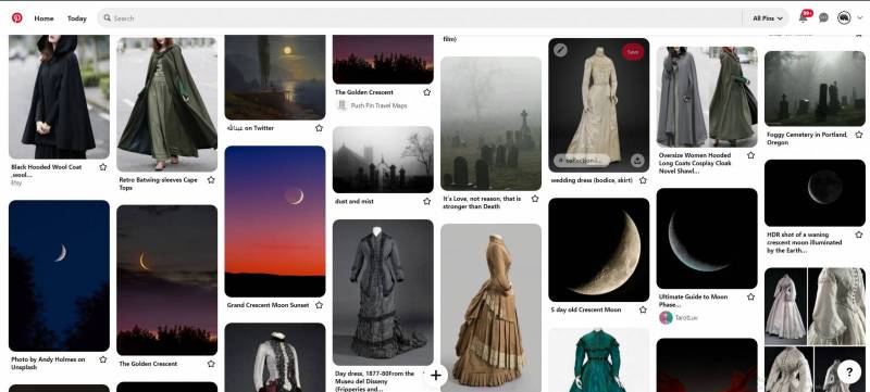 Above is a screenshot of my pinterest page when I was researching and browsing for this project. It helped give me ideas on what type of dress and the fashion elements that appeal to me, the shape or color of the moon, the look of the tombstones and environment, etc.