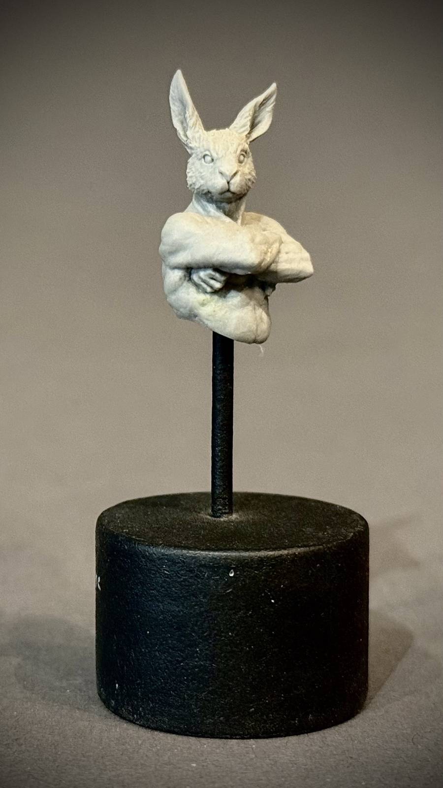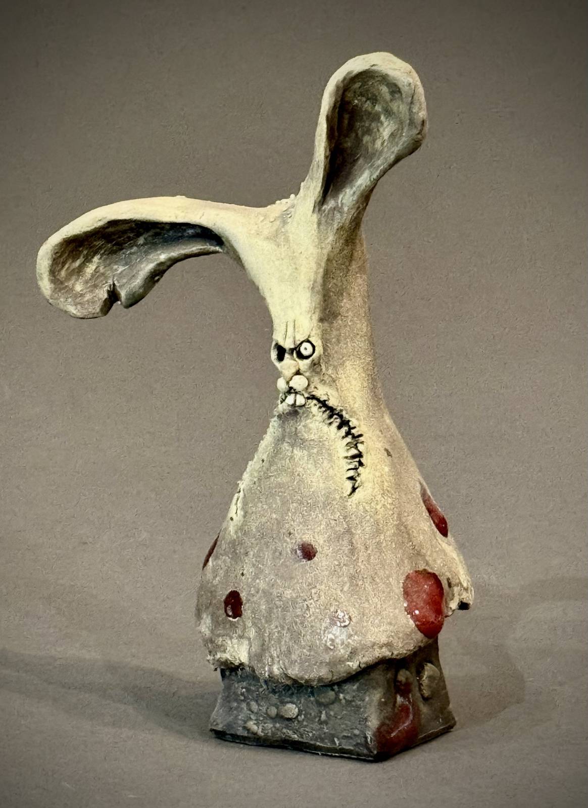 One more story from when I was young that inspired art that is now dear to me. My work in college was…well, angry, angst-filled, and challenging. Life-sized ceramic figures confronting invisible structures that squashed individuality and forced conformity, commentary on attitudes towards women and sex, screaming figures suffocating through their inner struggles – rage in sculptural form, I suppose. I’d been hanging out with a friend who went to the Center for Creative Studies in Detroit – at that time, a top tier art school. He shared his place with three other art students there – we’d crossed paths a few times. They knew I was a sculptor, but had never seen my work. One day my friend told me he’d showed them my slides (yep, that long ago!). He said they all got very quiet looking at them and after a long pause, said, “Well, we figured she made pink, fluffy bunny rabbits or something…”  Given the nature of my work at that time, I found that enormously amusing. Jumping forward many years, during Covid, Colin and I began a weekly video call with Dug Stanat and Patrick Masson, sculptors from California and France. We worked in our studios while we chatted and one day, that story about me “making pink, fluffy bunny rabbits” came up. To my absolute delight, on my birthday that year, they both sculpted rabbits for me in honor of that long time past – those sculptures have become mementos of our friendship and are two of my treasured favorites.