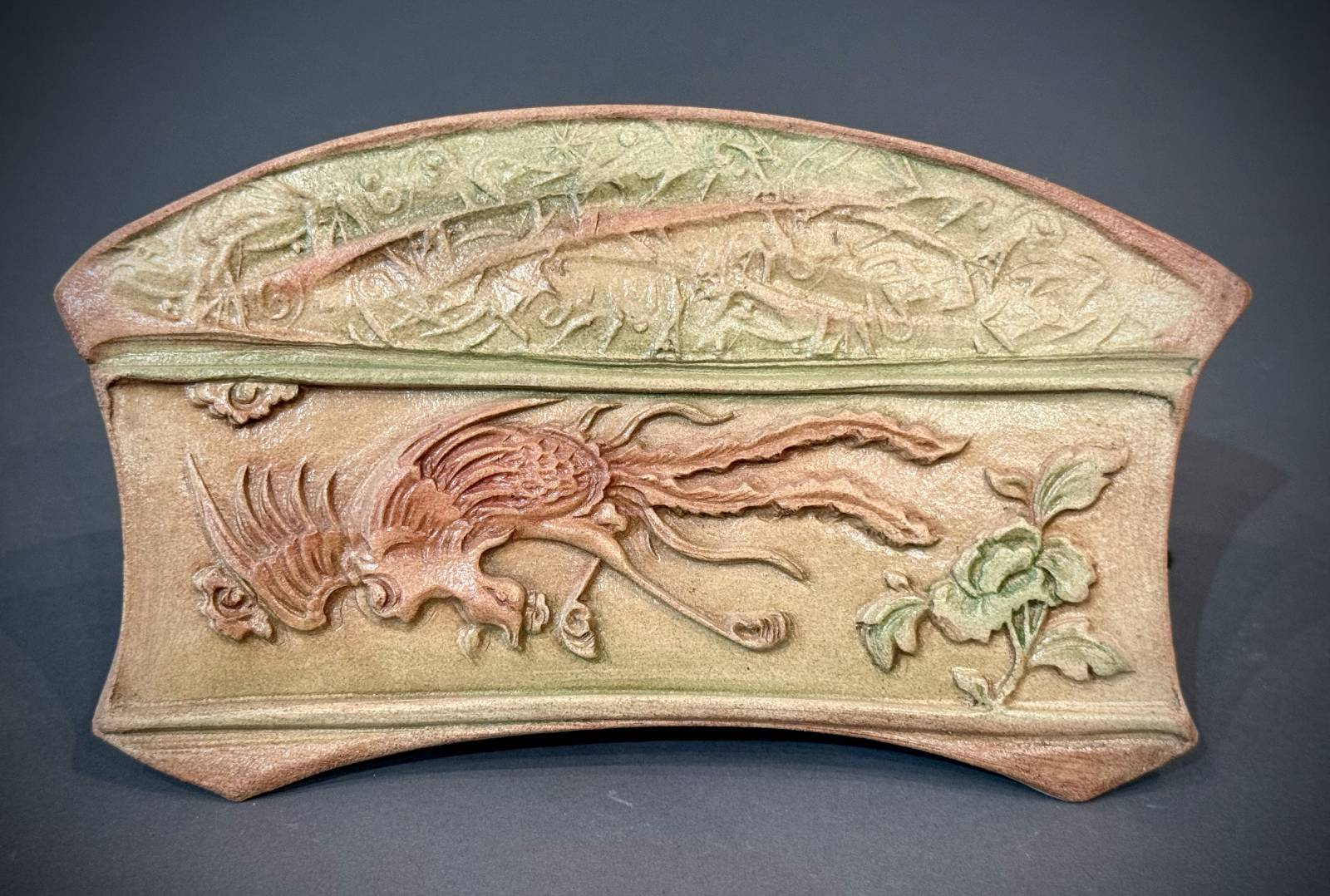 I met Paul Birchak when he was cashiering at our local food co-op. He is one of the kindest spirited people I have ever met and helped me through some challenging times. On my weekly visits to the store, we started talking about art, only to find out we both worked in ceramics. Before I had my own kilns, I had some sculptures that needed to be fired and Paul offered to help. I brought my sculptures to his place and he asked if I could help him with something very hard before we loaded the kiln. His old dog had reached the point where he needed to be put to sleep. Paul asked if I would be willing to help him afterwards as he didn’t think he could carry his old buddy by himself. Of course I said yes, and we spent the afternoon reminiscing about all the times they’d shared, crying and laughing together, as we laid his dear pup to rest. Later, I found this little ceramic wall piece with a phoenix that Paul had made. When I look at it, it reminds me of that day – the sadness, yes, but also the deep trust, love, and compassion that can be shared between people when they open their hearts to each other. The phoenix reminds me that even on the darkest days, rebirth, renewal, and happiness will come again.