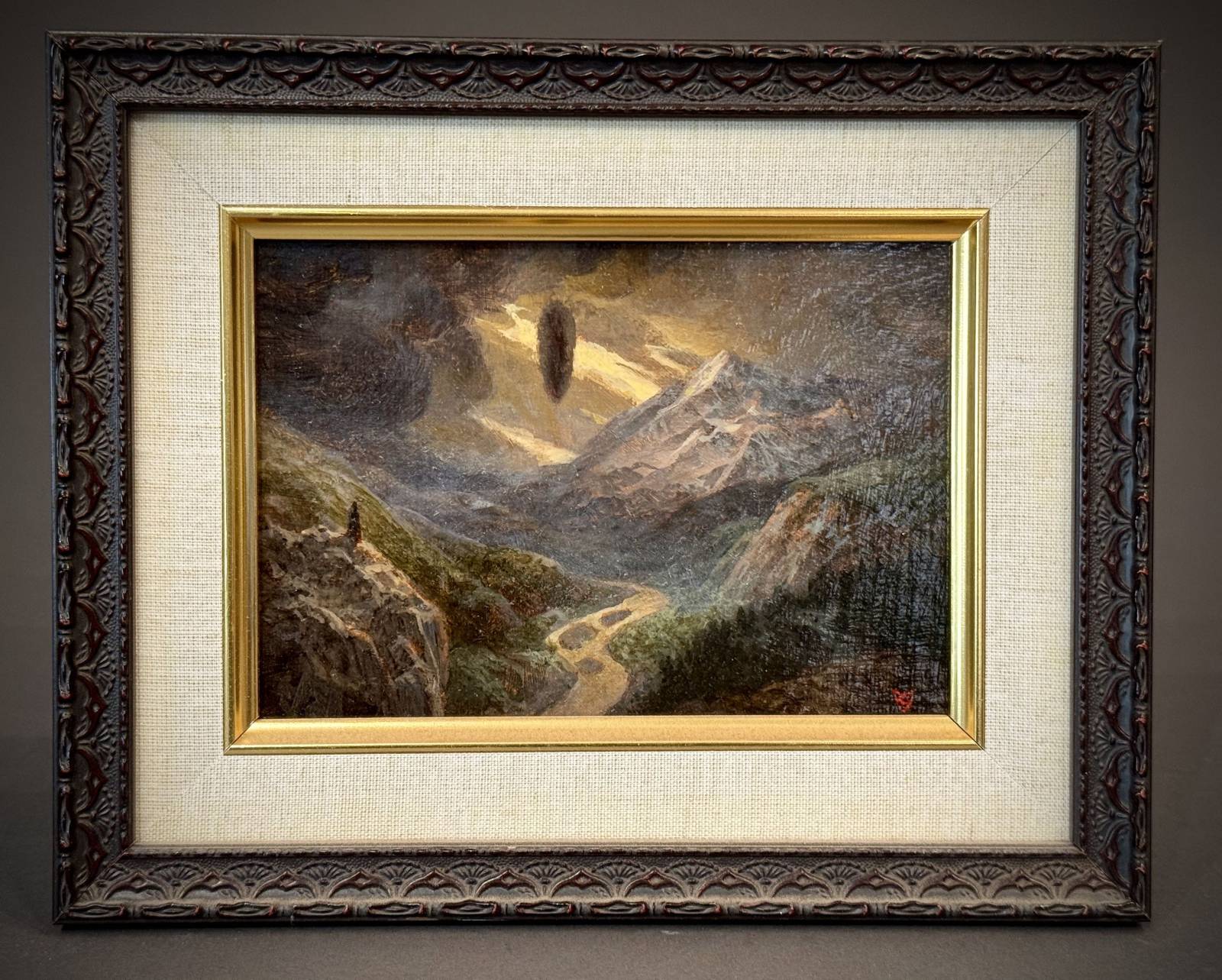 One year at IX, I spotted this magical tiny landscape by Christopher Vacher. I went up to the third floor any number of times to lose myself in the mystery of its subtlety and beauty. Finally, I asked Colin to come up and take a look – we always choose artworks that speak to both of us. When we got to his booth, Colin was so taken by Christopher’s sketchbooks that he didn’t even see the painting. I thought, “well, okay, I guess that one’s not for us.” But as the weekend progressed, my mind kept drifting back to the painting and, finally on Sunday afternoon I couldn’t resist any longer – I had to have it. I went upstairs only to find, to my despair, his space was empty! Christopher had left early to catch a plane. I got his phone number and texted him, “Please, please, please tell me you still have that painting! It needs to come home with me! Whatever it takes.” Fate fell in my favor that day and this beauty hangs where I see it first thing every morning. When Colin saw it, he immediately fell in love too. Even after these many years, I am still entranced with the ancient feeling enigma of this work.