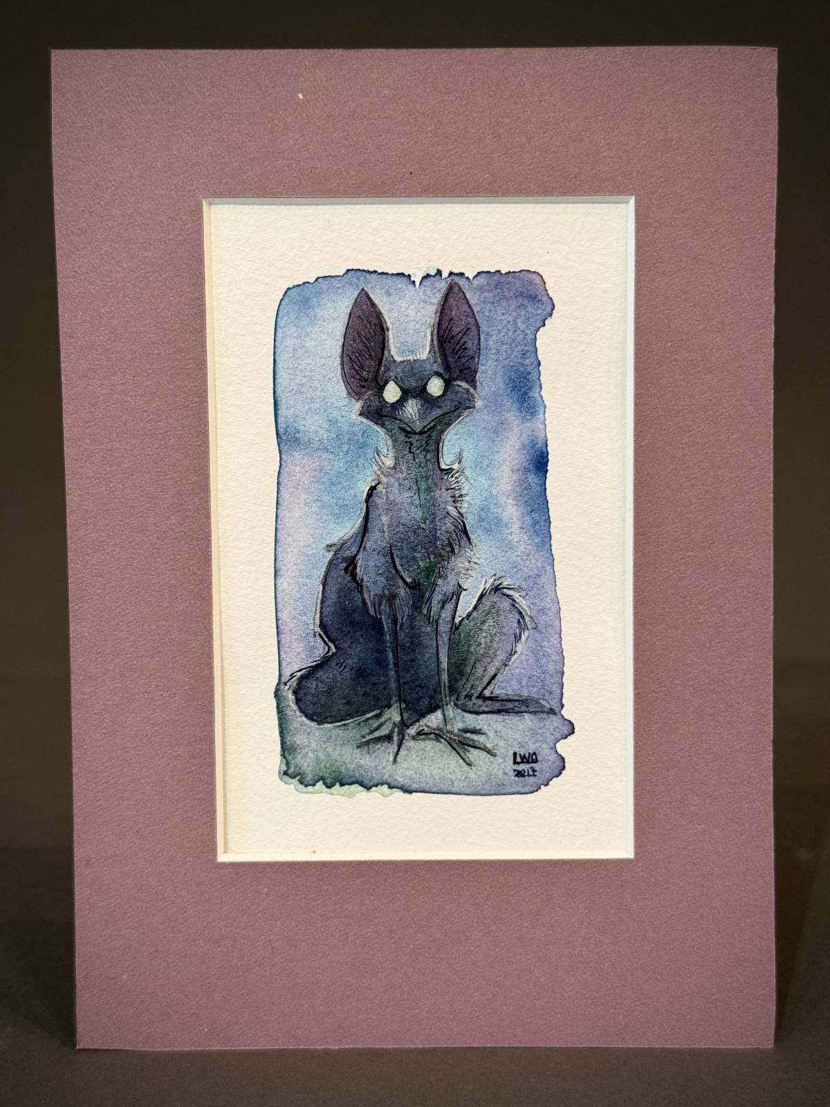 At the IX Showcase another year, we saw this beautifully painted little “Crow-yote” by Laura Garabedian. We didn’t know her at the time and chatted a bit – we loved the personality and the confident, masterful design of this lovely little work. I don’t know why we didn’t buy it right then – maybe got pulled away by other friends – but the next morning we saw her coming out of the elevator with the Crow-yote in hand. I said, “Ohhhh… you sold him then…”, happy for her but disappointed for me. And she said brightly, “No, he’s for you!” and handed him to us. We were so surprised and delighted, we didn’t know quite what to say – we became fast friends that very moment. This little painting opened the door to one of our most cherished friendships and he hangs where we see him every day.