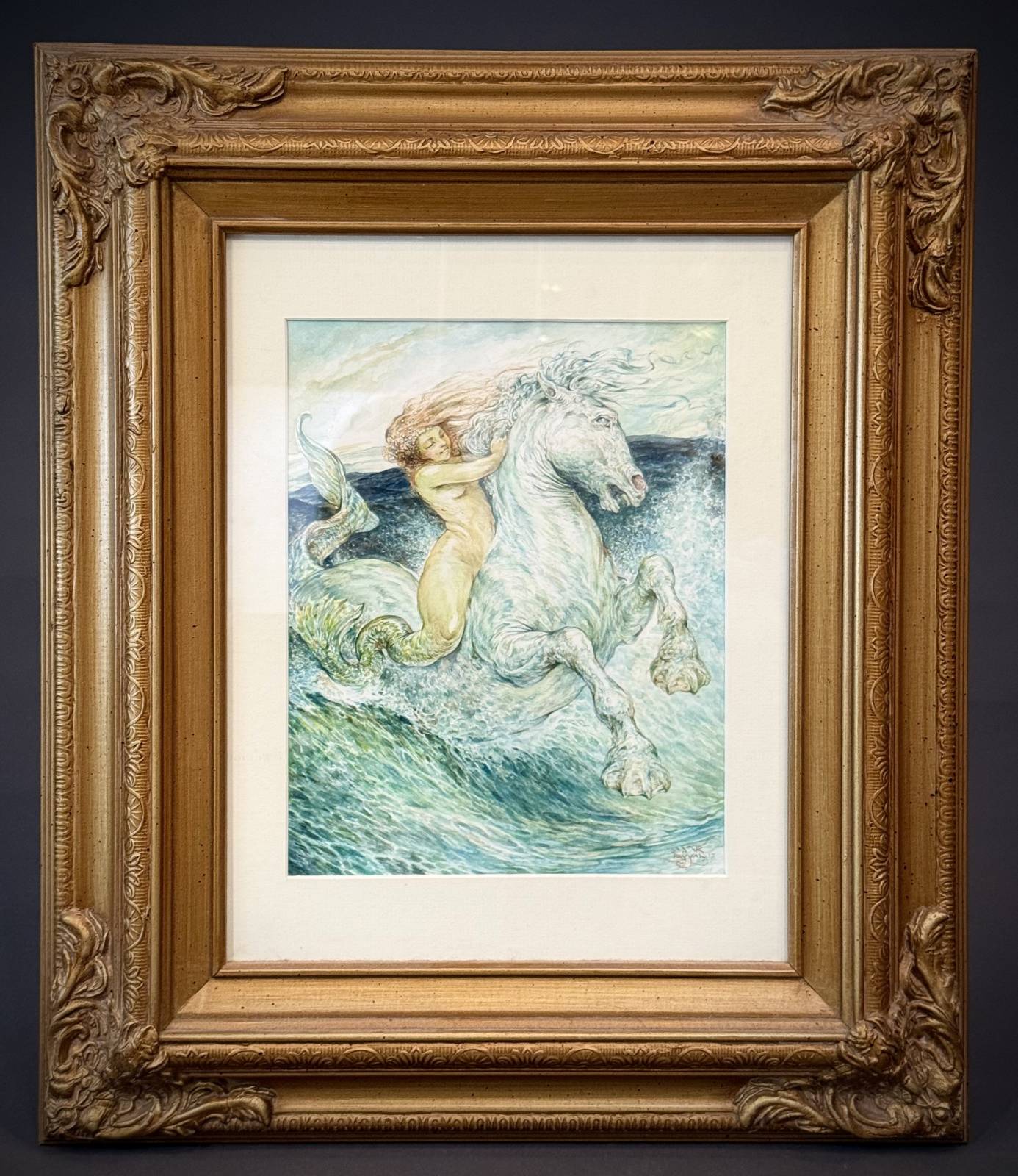 At one show, our booth was across from Omar Rayyan. We kept looking at this free-spirited naiad and her steed. Colin and I both loved it – the energy, the joy, the feeling –  but it was a bit out of our buying range. I figured we would just have to admire her during the show – fortunately we would get to see her the whole time. The second morning, a big, red “sold” tag appeared. My heart fell – maybe a part of me had been thinking we might still figure out how to purchase her. Imagine my delight, when at the end of the show, Omar walked over and with a smile, handed the painting to me. Colin had bought her as a gift knowing how much I loved her.