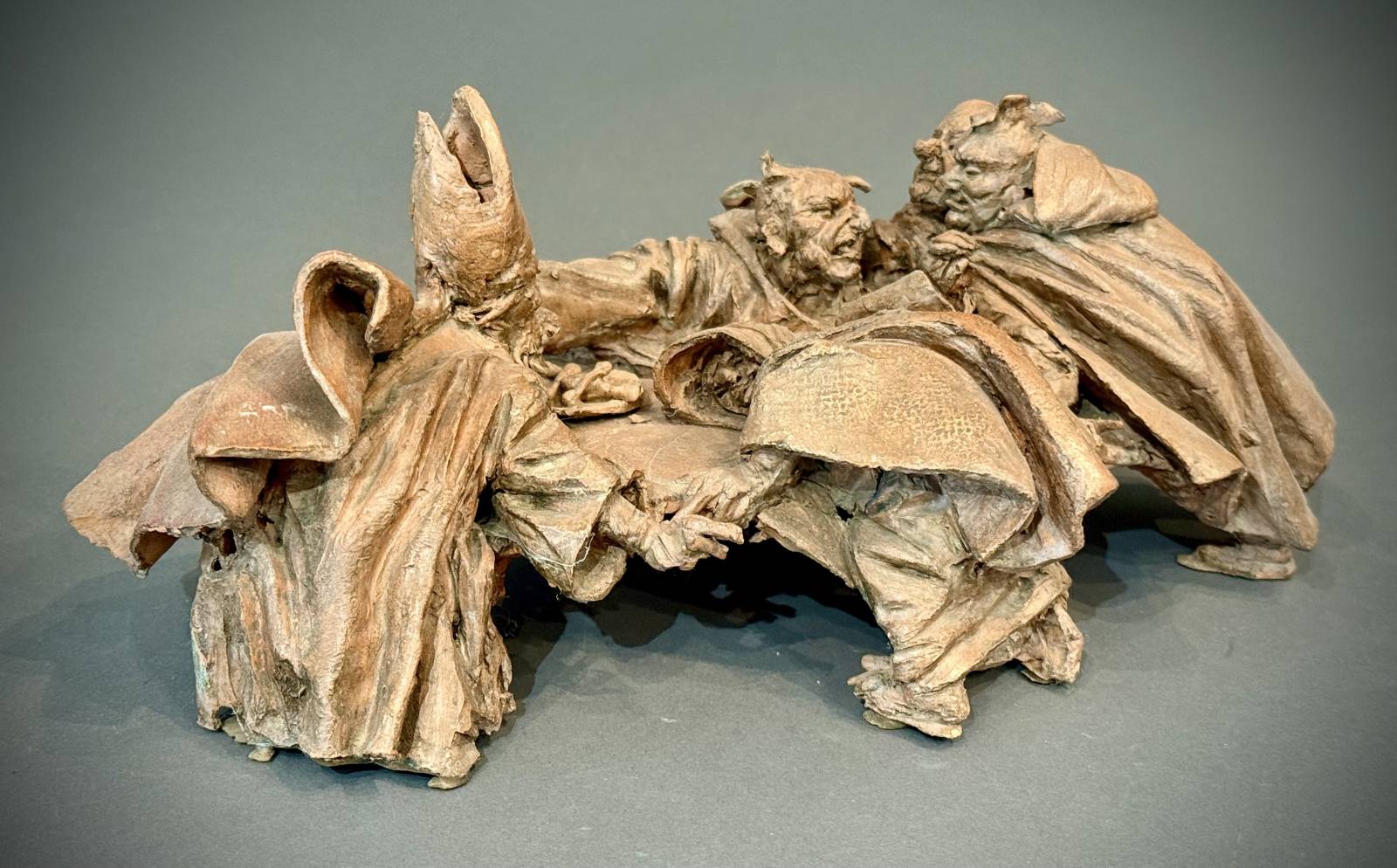 Perhaps it is fitting to begin with my first love. As a sculpture student at university, I was utterly enamored of a book on sculpting: “Terra Cotta: The Technique of Fired Clay Sculpture” by Bruno Lucchesi. Those dog-eared, clay spattered pages accompanied me on my journey in ceramic sculpture – teaching, inspiring, and encouraging me. Imagine my delight, when decades later, I came across a lot of his sculptures that was being auctioned. One piece was a very traditional Lucchesi sculpture of a woman, the other, this very non-traditional sculpture of four demons feasting at a table with the Pope, best I can tell. It charms me in so many ways: its irreverently unique subject matter, its connection to the long history of terra cotta bozzetti, its insistence on insinuating a story, the ease and gestural quality of the sculpting. The little details, from the plate of bones and partially eaten chicken, to the hoofed feet only visible on the backside, to the fellow seemingly taking a nap on the table, to the finger pointing and heated discussion at the other end, invite you to wander through the piece for hours. It makes me smile (and sometimes giggle) every time I look at it.