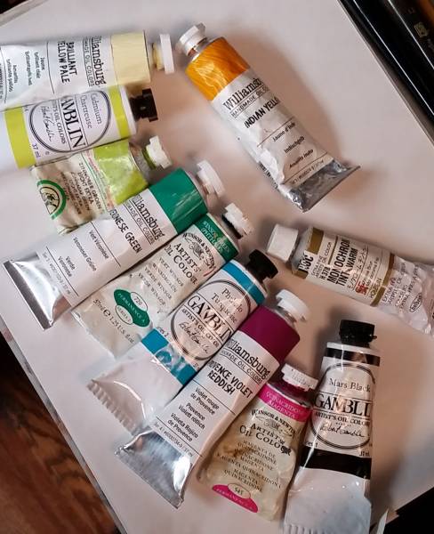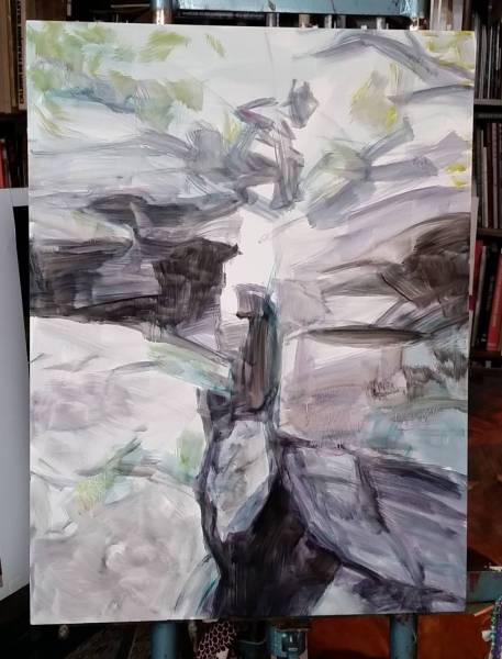 Later when I got the time to do the painting, I took photos throughout the process. These are ten-year-old phone photos, so not the best quality, but you can see how it progressed. From blocking in directly with oil paint (sometimes I do a detailed drawing right onto the surface, sometimes I transfer one from a printout of my sketch blown up to size, sometimes I go straight into paint) right up until almost finished.