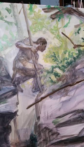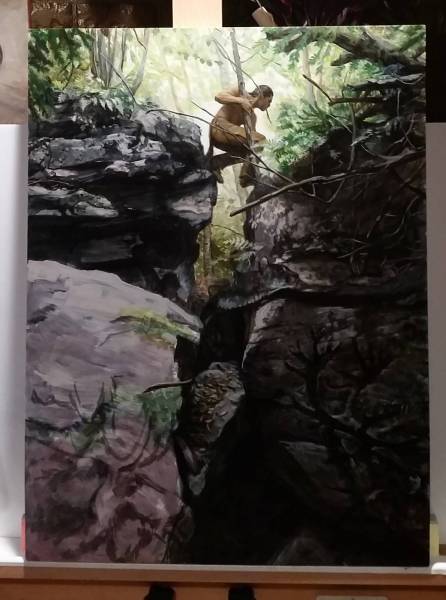A little over ten years ago, I was working on pieces inspired by my Ojibwe heritage. I had been planning a painting of the trickster figure/folk hero Nanboozhoo. I set up a cabin trip in the Poconos to go shoot photos for forest inspiration and reference. I invited some friends and family, so Simon was there in the woods with me, like old times.