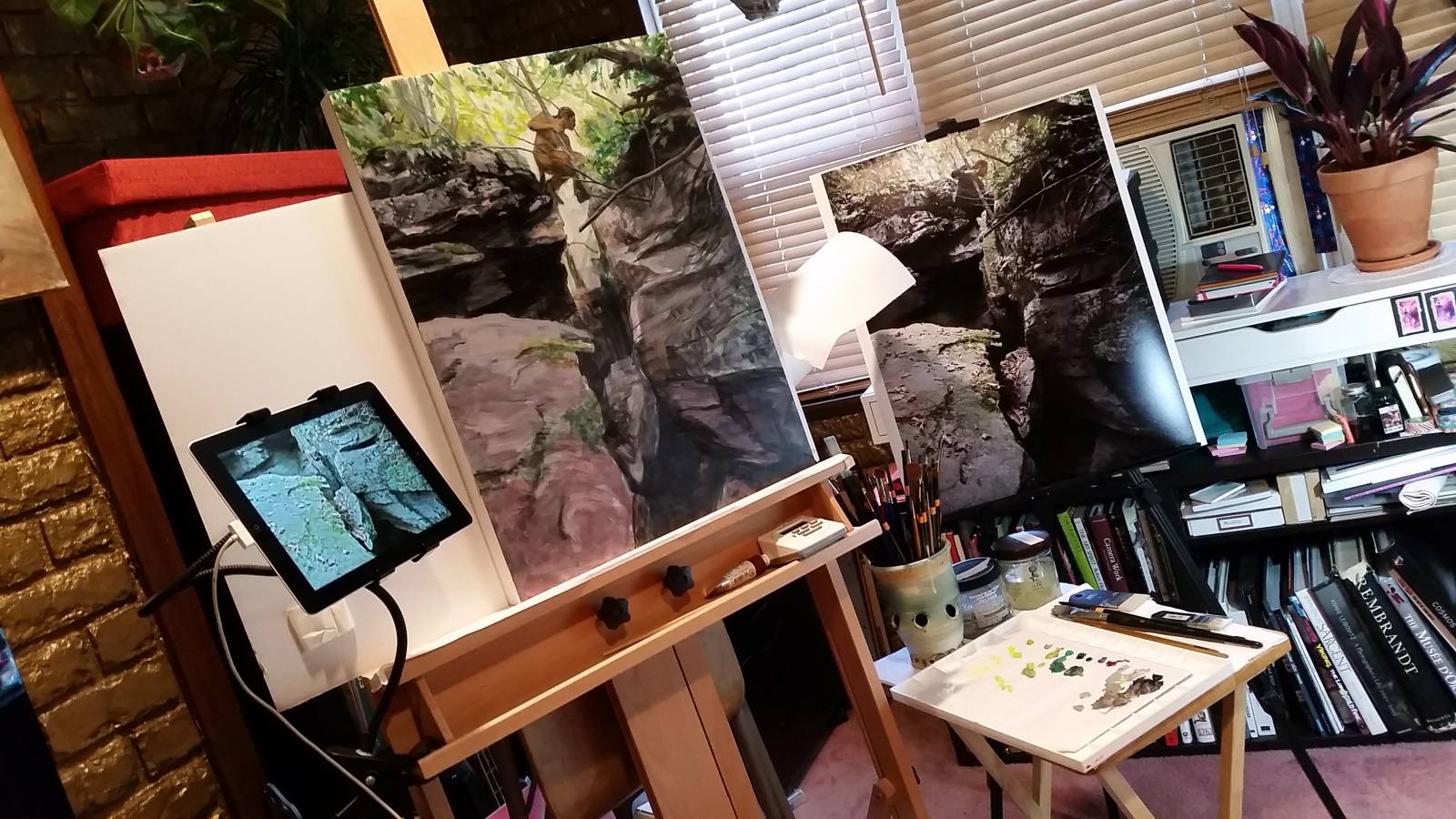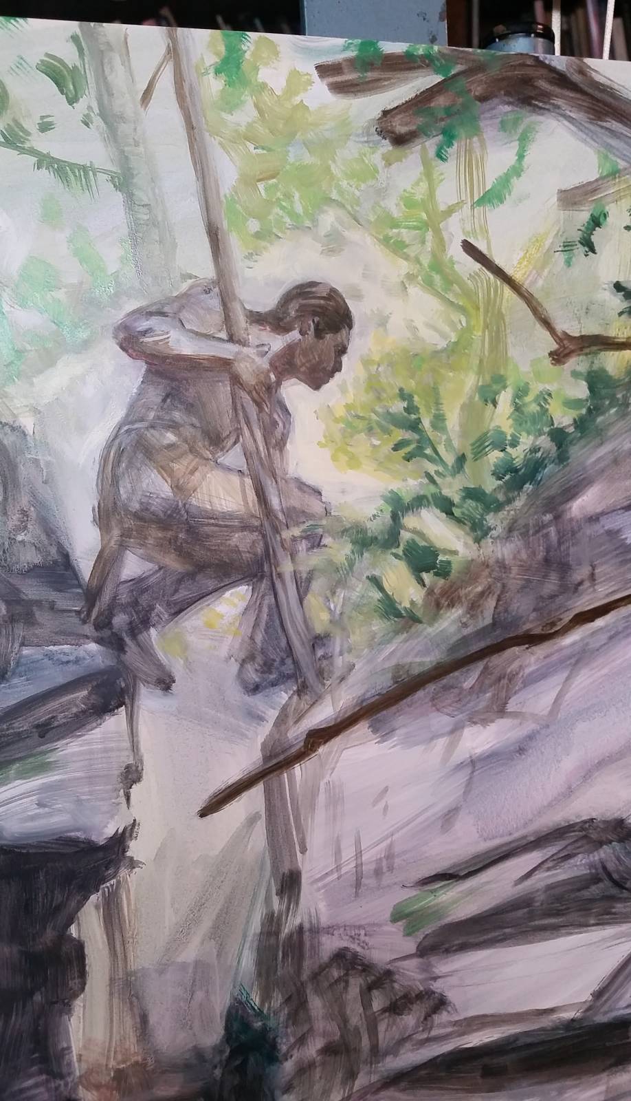 Later when I got the time to do the painting, I took photos throughout the process. These are ten-year-old phone photos, so not the best quality, but you can see how it progressed. From blocking in directly with oil paint (sometimes I do a detailed drawing right onto the surface, sometimes I transfer one from a printout of my sketch blown up to size, sometimes I go straight into paint) right up until almost finished.