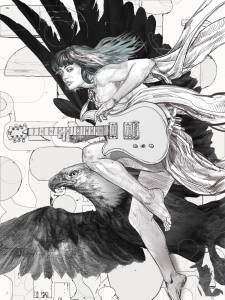Now, my plan was to change some things and make a new painting. Namely I wanted to give her a guitar and a a sort of 1960’s graphic background. And since there was a freakin’ eagle in the drawing, a BC Rich eagle was a fine choice for the axe. And while I was in there getting new ref for the guitar arms, I redid her face too. Much better.
