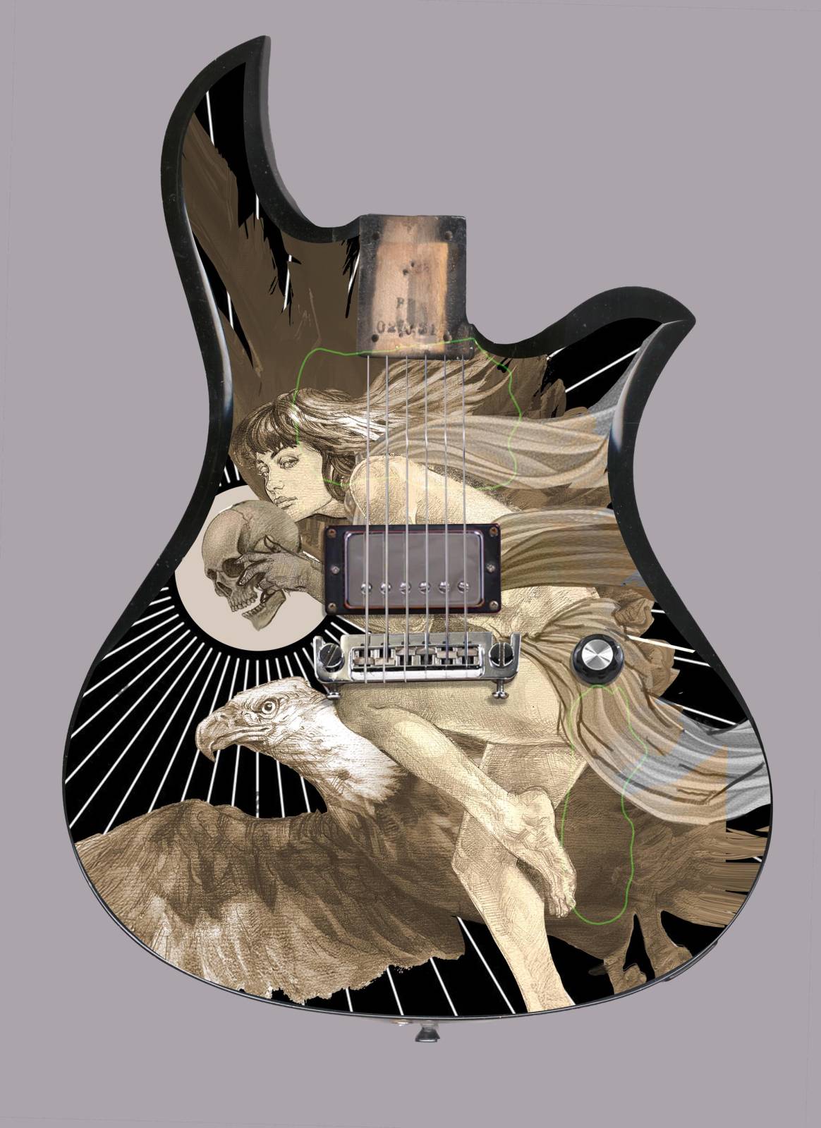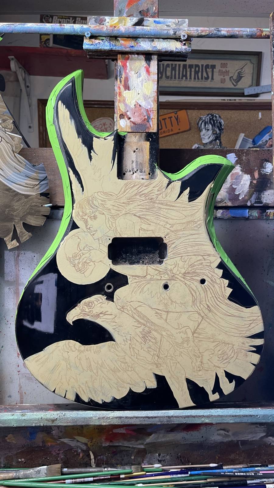 Being a guitar addict, I have a million guitars, but guess what I didn’t have? A BC Rich Eagle. I guess I was jealous of the girl in the drawing, so I bought one. “No honey I really need it for the photo ref! Plus it is a tax write off!” But the more I thought about it the more I wanted this concept to go next level. “Turn it up to 11 dude!” So now, in addition to the painting, I am painting a second version of the girl on the actual guitar. Is this life imitating art, or art imitating life? I am confused.
