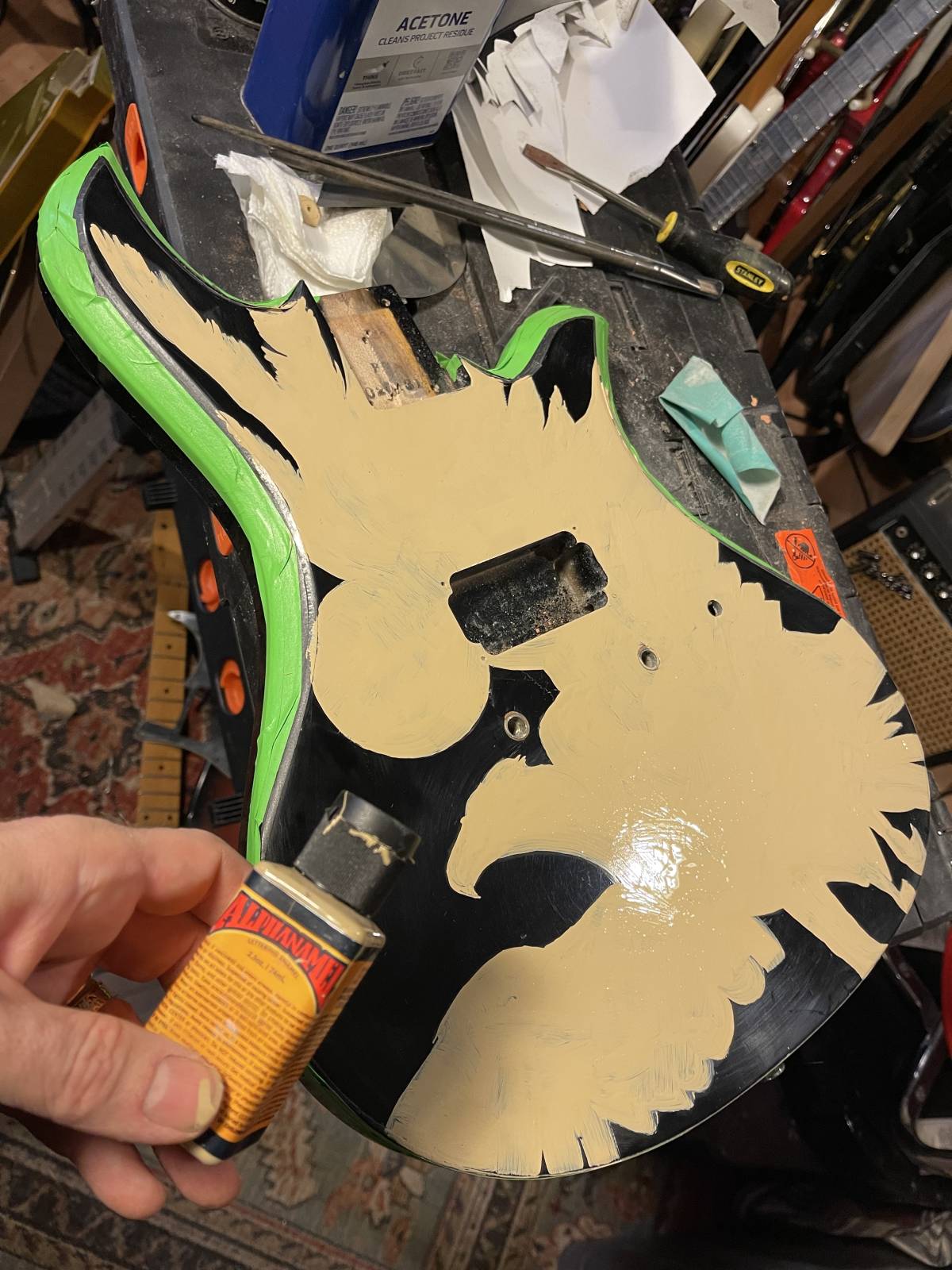 Lets go! I start by filling a couple extra pesky holes in the body. Then I printed the design out to scale, and  made a stencil of the silhouette, and sanded just that area where the new paint was going down. This will make the paint adhere better. However I wanted to keep the original black body paint in the neg space, thus I wanted to protect it. I got out the Alpha Enamel and filled in the silhouette with a tan color. The whole silhouette, I am not worried about where she ends and the eagle begins yet.