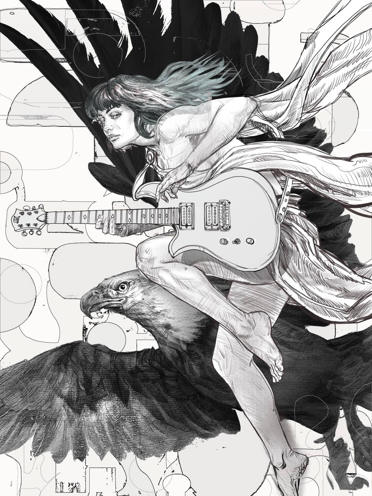 Now, my plan was to change some things and make a new painting. Namely I wanted to give her a guitar and a a sort of 1960’s graphic background. And since there was a freakin’ eagle in the drawing, a BC Rich eagle was a fine choice for the axe. And while I was in there getting new ref for the guitar arms, I redid her face too. Much better.